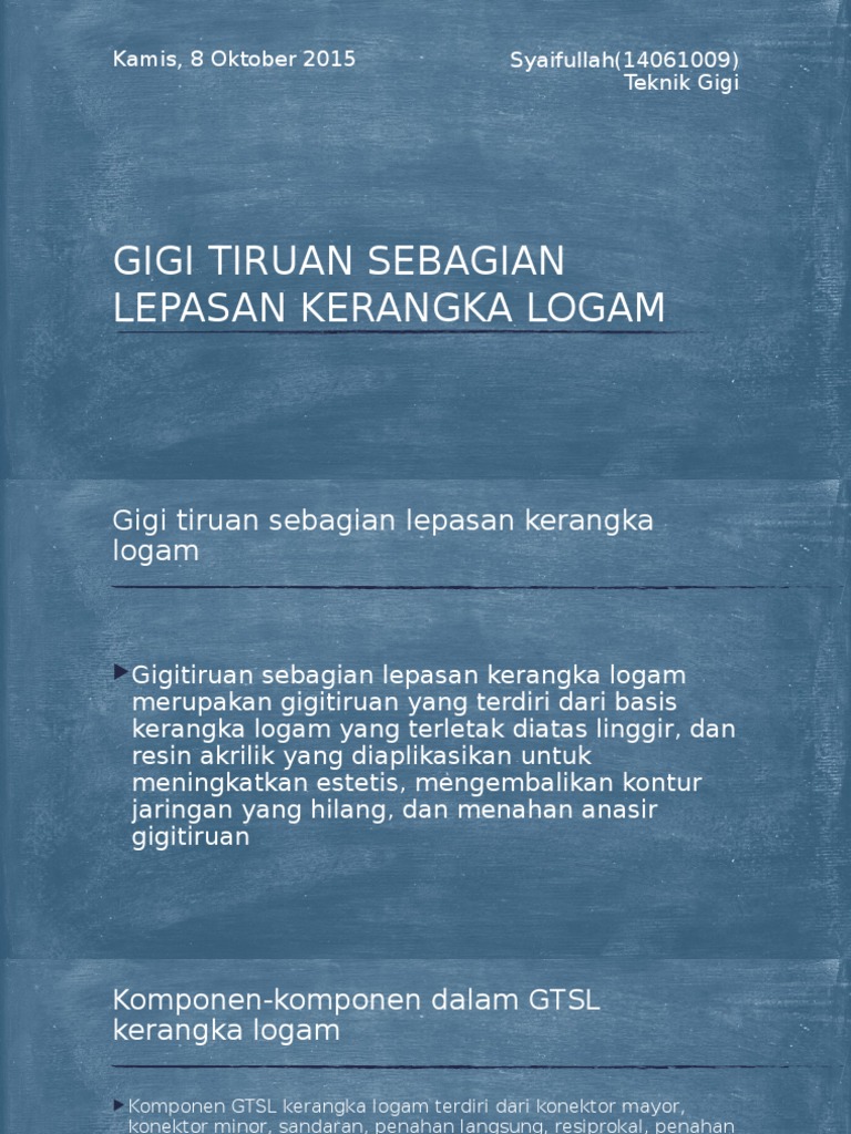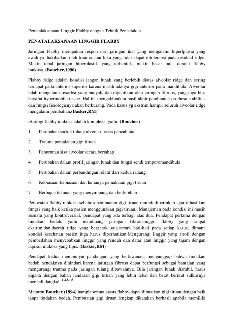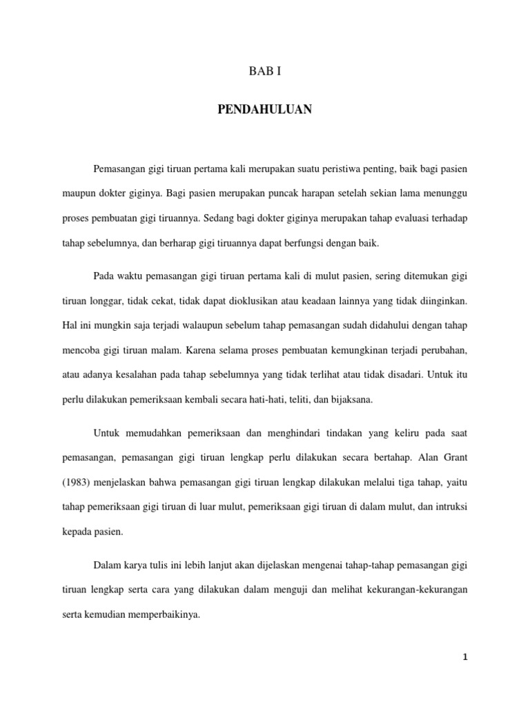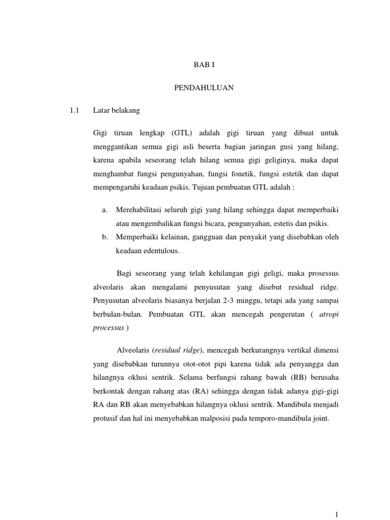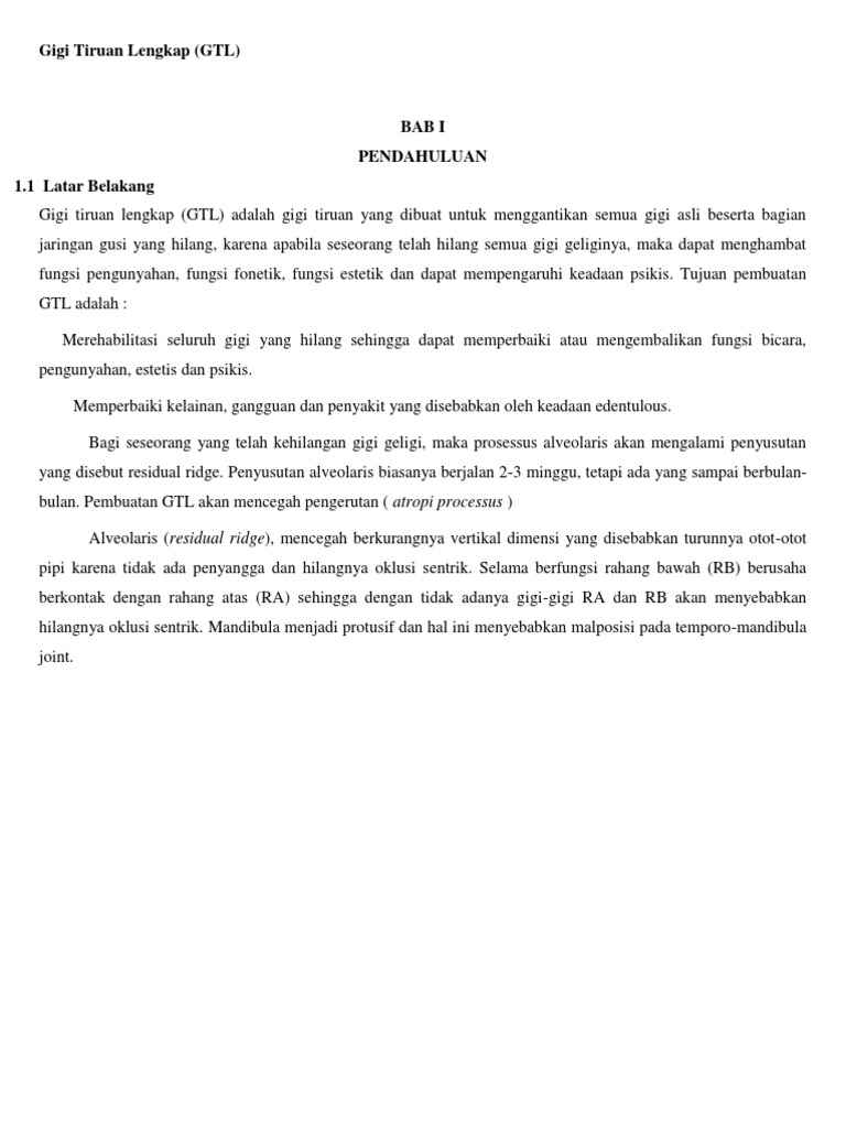 Mencetak tugas paper penetapan gigit pada pembuatan gigi tiruan lengkap aditya hayu 020610151 bab 3 metodologi penelitian 3.1 jenis penelitian jenis penelitian ini adalah penelitian analitik. Gigi tiruan lengkap (gtl) bab i pendahuluan 1.1 latar belakang gigi tiruan lengkap (gtl) adalah gigi tiruan yang dibuat untuk menggantikan semua gigi asli beserta bagian jaringan gusi yang hilang, karena apabila seseorang telah hilang semua gigi geliginya. Gigi geraham belakang (gigi molar), yaitu jenis gigi yang memiliki 2 atau 3 akar dan mempunyai fungsi untuk menggilas, melumat, menghancurkan, dan menghaluskan makanan. Gigi tiruan lengkap (gtl) bab i pendahuluan 1.1 latar belakang gigi tiruan lengkap (gtl) adalah gigi tiruan yang 3. Pembuatan gigi tiruan lengkap memiliki beberapa tujuan.